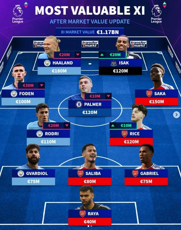中场:福登(曼城,1亿欧)、罗德里(曼城,1.1亿欧)、帕尔默(切尔西,1.2亿欧)、赖斯(阿森纳,1.2亿欧)、萨卡(阿森纳,1.5亿欧)